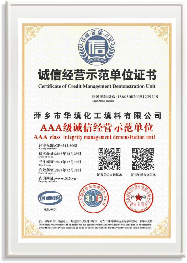 萍鄉市華填化工填料有限公司,位于320國道、109國道、浙贛鐵路、昌金高速公路貫穿其中,交通便利,是江西西部一顆燦爛明珠,創建于20世紀70年代初期,是中國石油天然氣股份有限公司“能源一號網”會員企業、中國石化物資采購電子商務網絡和中國海洋石油總公司采辦業務系統成員單位,是上海大學江西材料基因組工程產業研究院工業陶瓷產業創新聯盟基地,且通過ISO9001:2015質量管理體系、ISO14001:2015環境管理體系、ISO45001:2018職業健康安全管理體系認證的化工填料生產企業。公司擁有陶瓷、塑料、金屬填料、催化劑、活性氧化鋁、分子篩等產品生產線,現有固定資產3616萬元,占地面積3.8萬平方米。公司具有悠久的生產歷史、雄厚的技術力量和先進的生產工藝設備,可生產工業瓷球(支撐劑)、陶瓷、金屬、塑料質的規整、散堆化工填料及分子篩、催化劑、生化濾料、活性氧化鋁、石化助劑、活性炭、環保材料、耐火材料等系列的200多種規格型號產品。